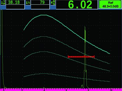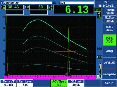 全屏模式下明亮的VGA显示EPOCH 650仪器配备一个全VGA(640 × 480像素)分辨率的显示屏。其横宽竖窄的面板设计优化了出现在高质量显示屏上的A扫描的大小及可读性。其显示屏使用透反技术,在光线较暗的室内使用强背光,在阳光直射的情况下使用环境光作为假背光,因此在大多数情况下都可以提供优质清晰的图像。 其全屏模式进一步增强了屏幕图像鲜明清晰的特性,而且可提供所有EPOCH系列探伤仪中最大的A扫描! | EPOCH 650 DGS/AVG功能 - 全屏模式 |